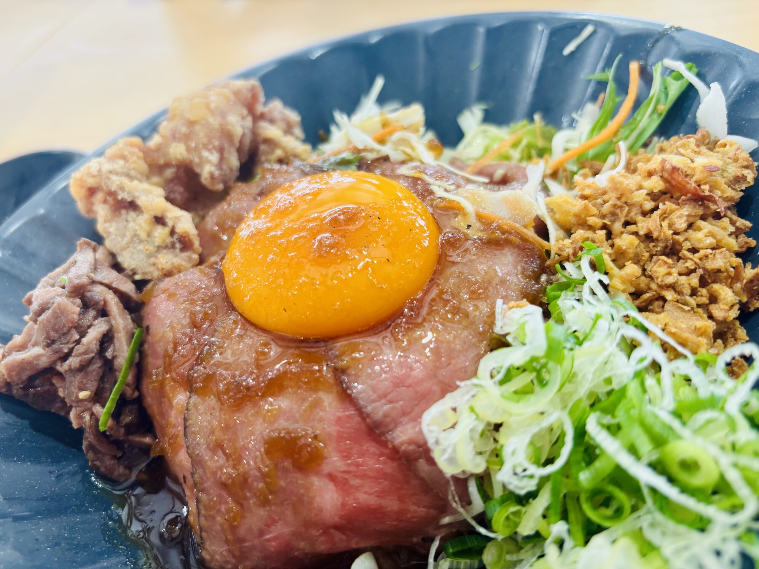 卵黄トロトロ、フライドオニオンがシャキシャキ、食感がめちゃくちゃ豊かな丼でした!(男性にいはちょっと物足りないかも、量的に)